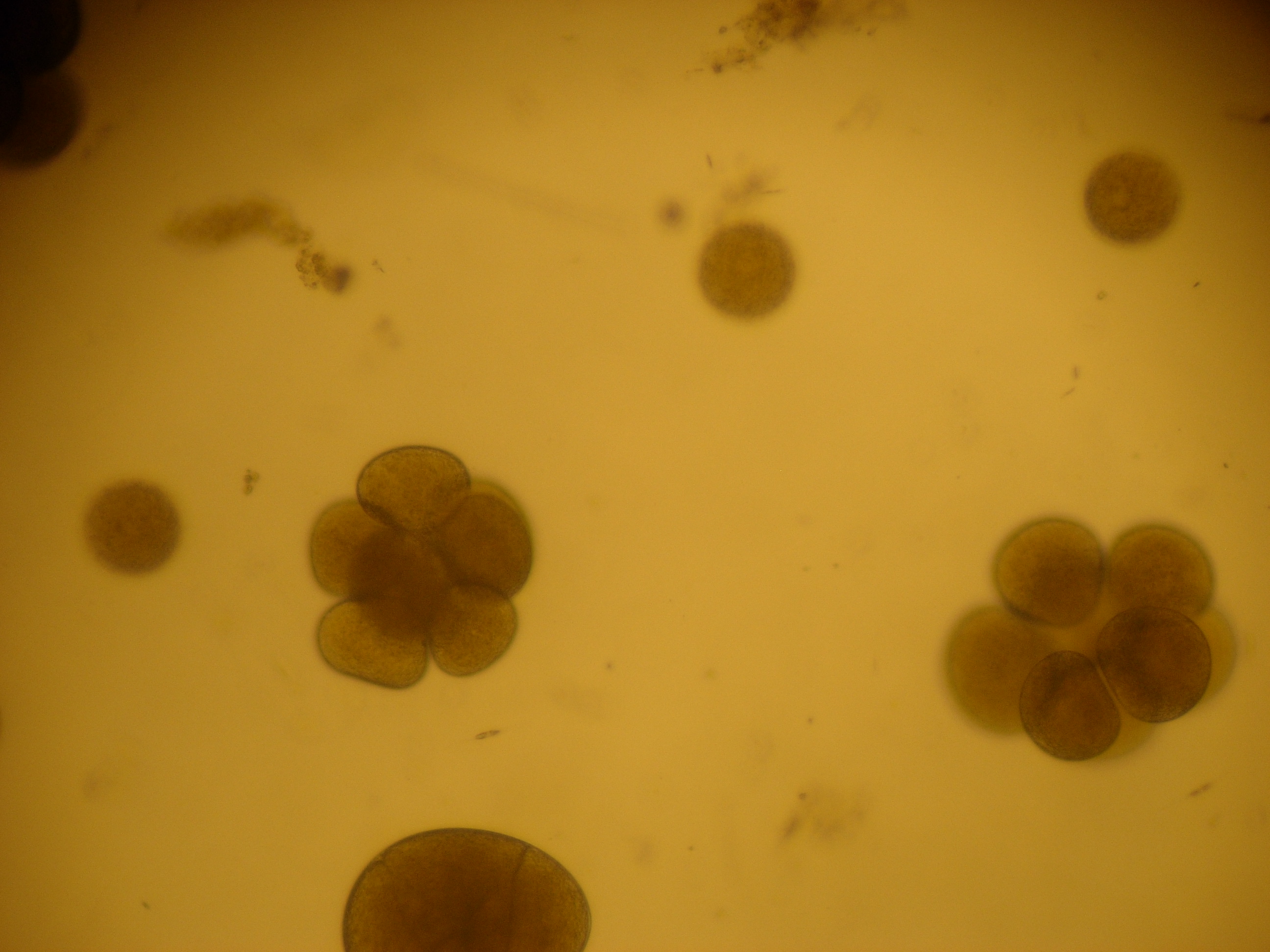 Two oogonia are opening up, setting their 8 eggcells free. The eggs have a perfect round shape, three can be seen slightly out of focus. Fucus eggs are negatively buoyant, wich means that they will sink down to the sea floor when they are released into the water column.